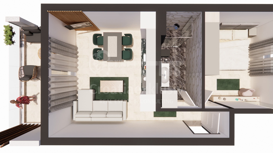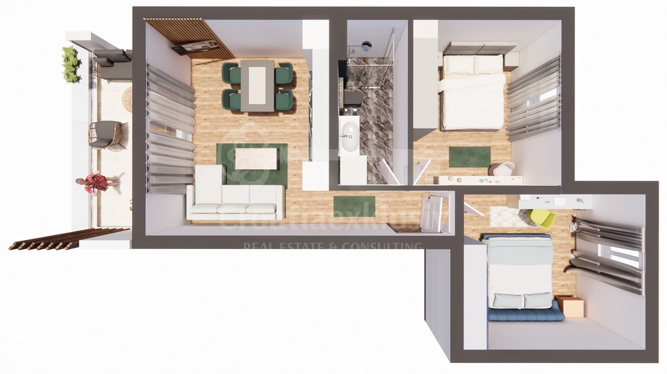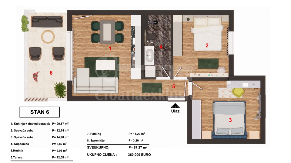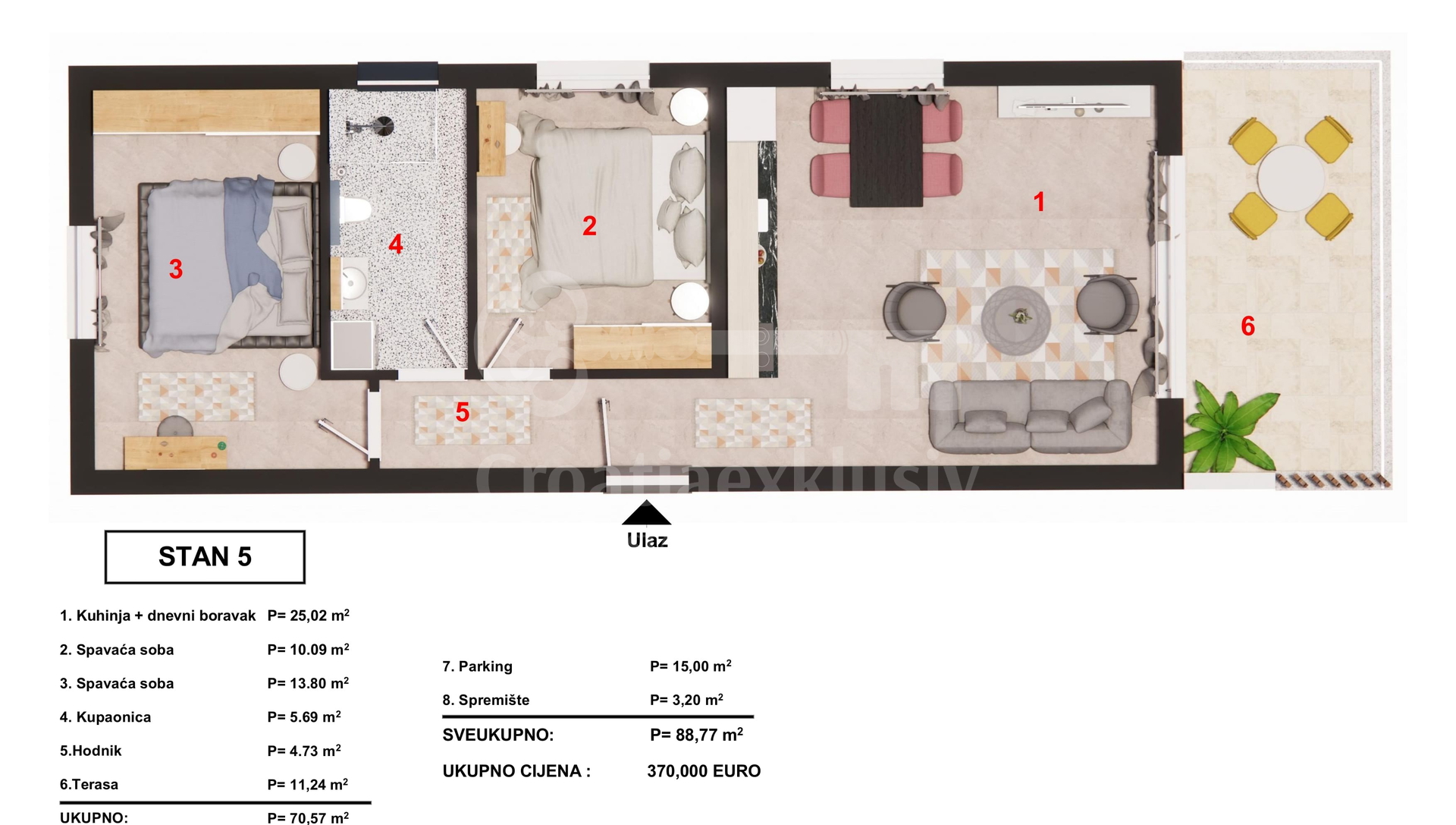 Die Wohnungen eignen sich ideal für touristische Vermietung, ganzjähriges Wohnen oder als Investition. Jede Wohnung verfügt über einen Parkplatz und einen Abstellraum, einige auch über einen privaten Garten.