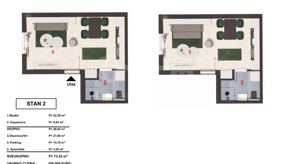 The property includes one parking space of 15.70 m2, with the option to purchase an additional parking space, as well as a storage room of 3.20 m2.