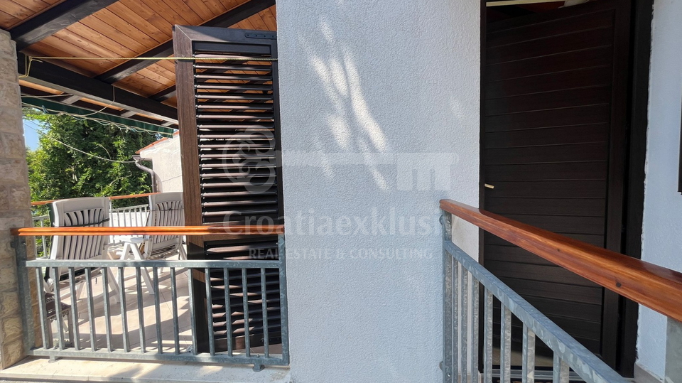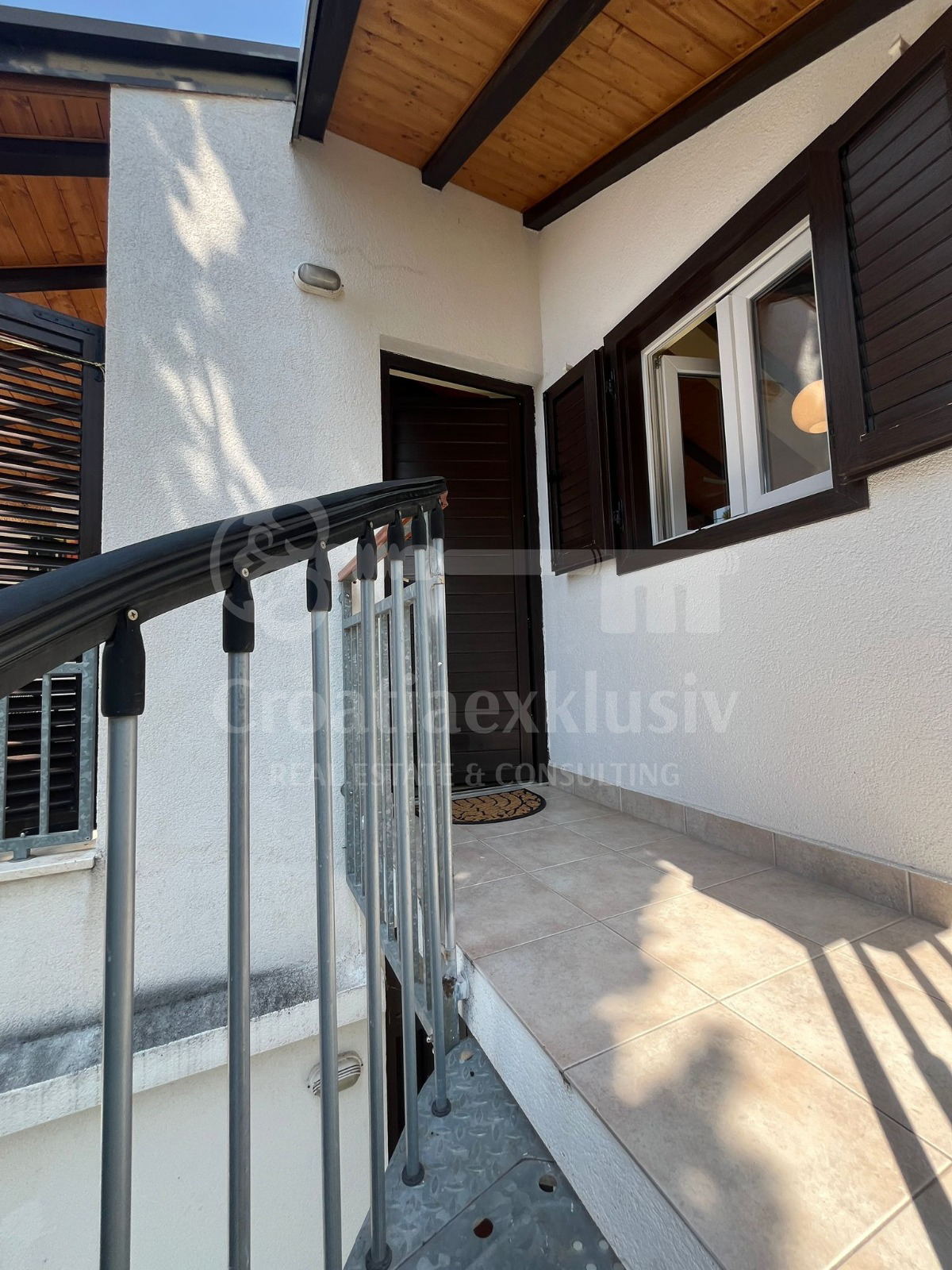 KAT: vanjskim kružnim stepenicama se dolazi na kat gdje se nalazi stan veličine 36,56m2 Stan ima veliku terasu sa pogledom .Stan se sastoji od spavaćeg dijela spojenog sa dnevnim dijelom i kuhinjom, kupaonicu i prekrasnu terasu sa pogledom.