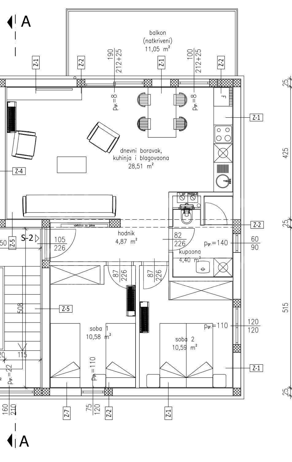 - 	Otvorene kuhinje s blagovaonicom i dnevnim boravkom, s izlazom na natkrivenu terasu (11,05 m2)